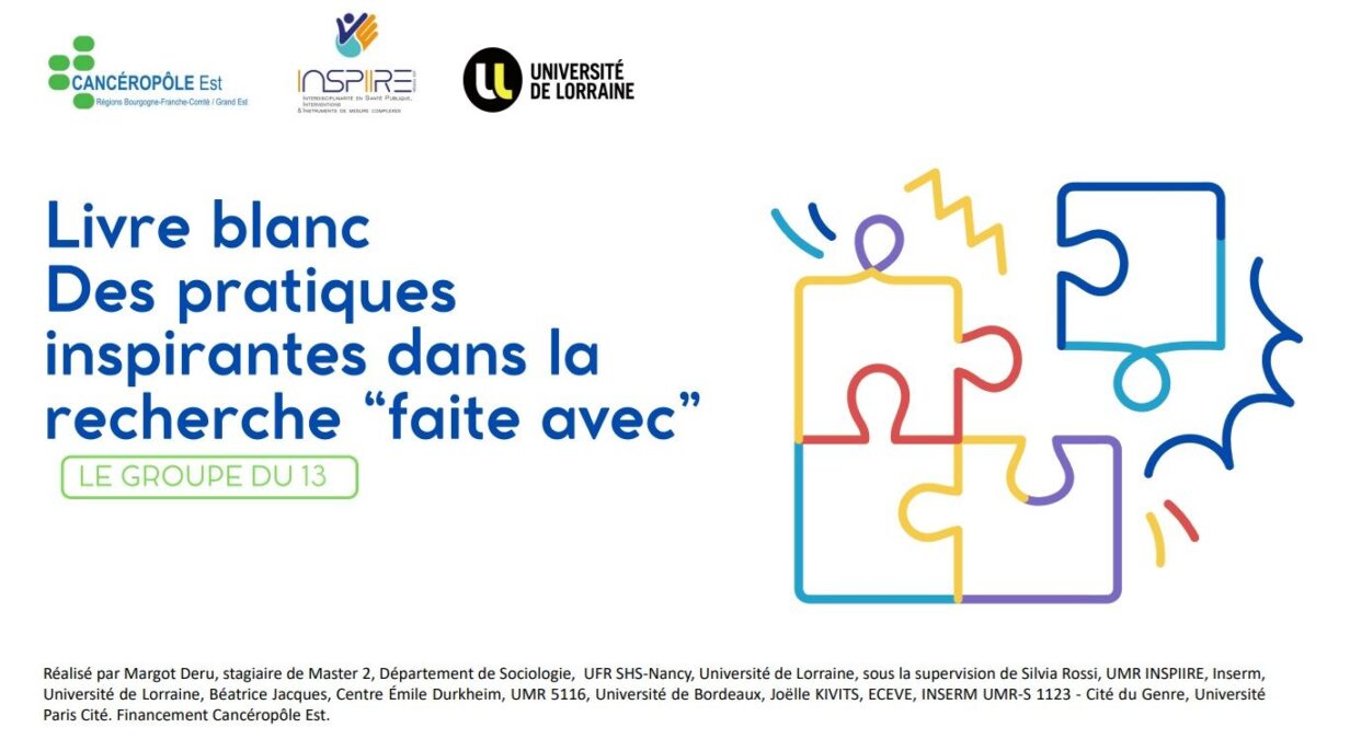 Dans le cadre de ce groupe, il a été réalisé un travail d’analyse des pratiques de ses membres afin mutualiser les expériences, les réussites et les méthodes adoptées pour dépasser les freins dans les démarches de recherche « faite avec » (financement Cancéropôle Est). Il en résulte un livre blanc présentant des pratiques inspirantes dans la recherche « faite avec », que nous sommes ravies de partager.